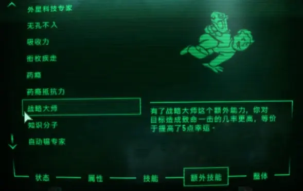 ②暴击系数(CRIT%)每种武器不一定相同。(实际暴击概率为自身暴击率X武器暴击系数)10点幸运值(Luck)为10%基础暴击率;玩家10级时有“战略大师”特技+5%;完成《废土生存指南》任务+3%(全部选择讽刺回答)。