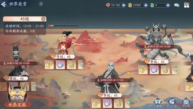2、宝箱通过世界悬赏活动获得,开启时间为每日12:00~21:00,,玩家每天有3次获取奖励的次数;同等级世界下,每个Boss掉落奖励及排名奖励相同!