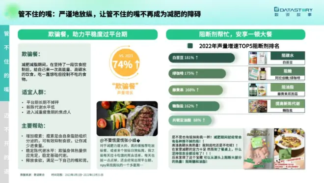 2022年历经疫情反复和防疫政策的逐步放开,健康责任主体聚焦在消费者身上,人们的健康意识较上一年增强,对健康需求的讨论热情日渐高涨减肥减脂及睡眠健康仍保持主体地位,用户需求呼声有所增长,成熟的市场中仍存在机会点;肠胃健康的增长动力稍显不足,需要寻找新的机会点,带动新增长。