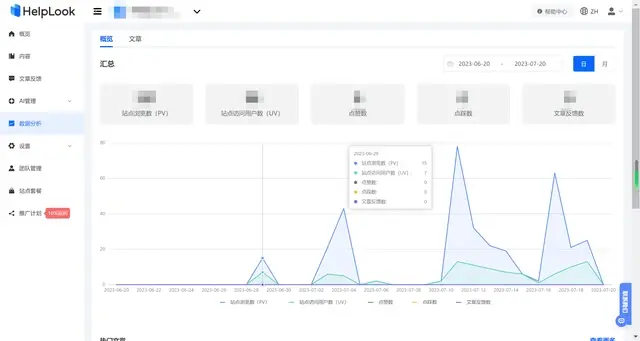 如图,HelpLook后台提供数据分析工具,可以了解整个站点的数据信息,便于收集用户反馈,追踪效果,从而科学调整页面内容。