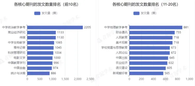 “中学政治教学参考”期刊发文量最高,为2205篇,“商业经济研究”期刊紧随其后,“传媒”期刊名列第三。