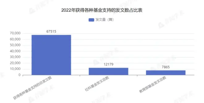 在2022年发表的132584篇论文中,获得各种基金支持的论文数为67515篇,占比为52.59%。