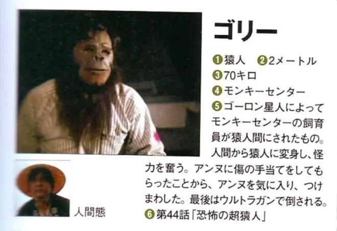 猿人戈利是一个可悲的试验品,原本是猿猴研究基地的饲养员,但在戈隆星人控制了研究基地后,他被戈隆星人用脑波交换装置将大脑与猴子大脑进行交换,失去了人类的智能和人格,成为了猿人类。
