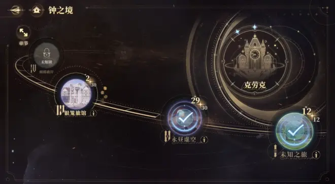 因此,主线剧情基本上就是主角在一个又一个子世界中穿越,解决一个子世界的问题之后就去下一个子世界。主线章节界面的UI设计,也表现出了众多子世界如同主世界的卫星般环绕存在的感觉,一个子世界便是一个章节,主角则是串连起这些故事的一个记录者。