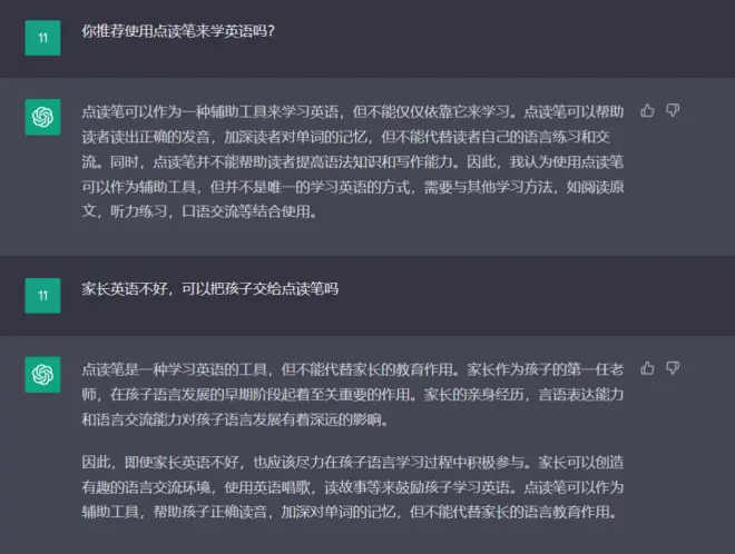 比如,我首先提了一个关于是否能用点读笔来学英语的问题,这是很多家长的误区,不少家长认为自己英文不够好,发音不标准,点读笔比自己带更合适。我之前做过一期视频号,详细说过为什么不可以。