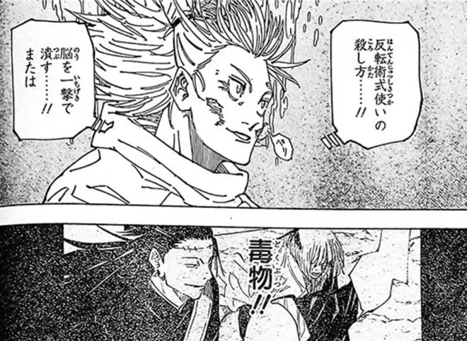 这里需要注意一点,想要击败使用反转术式的术师有两种方法,除了之前说的击碎大脑之外还有一个方法,那就是剧毒。不过剧毒也可以被反转术式分解,这就需要更加高级的反转术式,恰好秤金次的反转术式就是最高级的全自动反转术式。