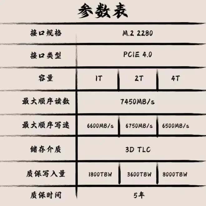这款产品售后方面,4T是质保写入量为8000TBW,品牌方敢标注这么高,肯定是有底气的,毕竟现在很多国产4T SSD的质保写入量,都在8000TBW左右。而五年质保,也是符合主流售后时间的。
