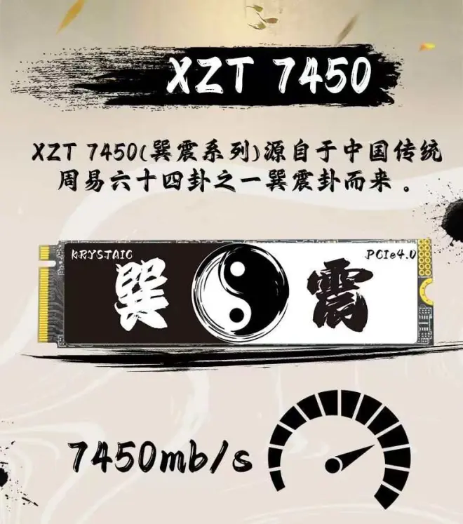 产品贴纸充满中国风,产品名命也与太极八卦有关,晶太XZT 7450属于巽震系列。有懂太极八卦的网友,可以说说小这个巽震是什么意思吗?我在网上查了一下资料,没看到。好像是说风雷,利有攸往,利涉大川。至于7450,就是它的读取速度,是PCIe4.0 SSD满速,这性能足够用了。