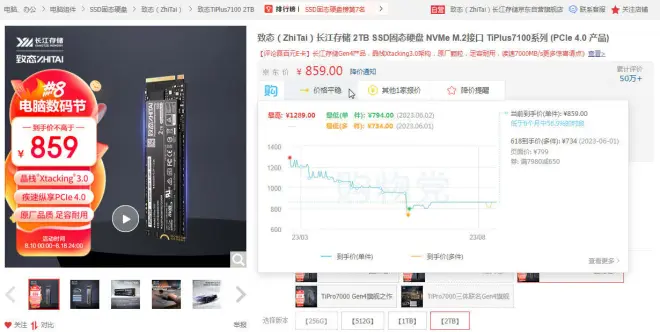 以致态TiPlus7100 2T某东的价格为例,在618期间,它的最低是794元。618活动结束后,涨至了859元。在8月10时,搞活动又降到了809元,现在又涨至了859元。价格方面,基本上没有大的变化。大家要区分开活动价与日常价,反正最近这三个月,致态TiPlus7100 2T版的产品,它的日常价是没有变化的,何来涨价之说?