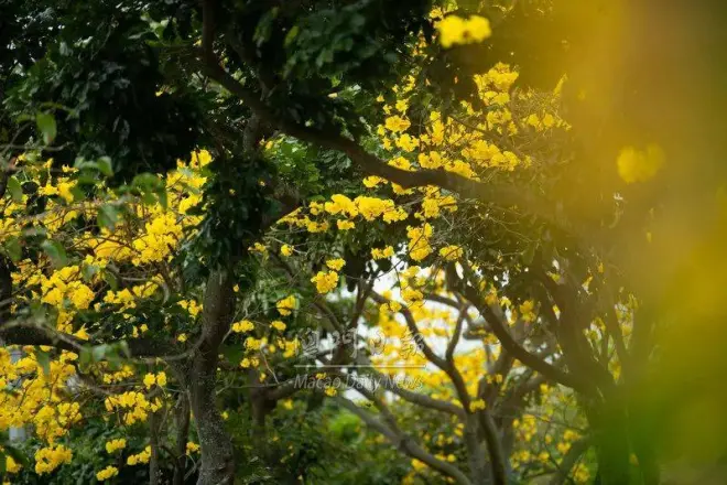 阳春三月,万物复苏。氹仔海滨休闲道一旁,黄花风铃木艳丽绽放,满树流金,带来了春天的第一抹金黄。团团簇簇的黄花在道路另一旁的嫩绿新翠映衬下,清新透亮,春意盎然。黄花风铃木的花期较短,及早探春,毕竟春色不等人。
