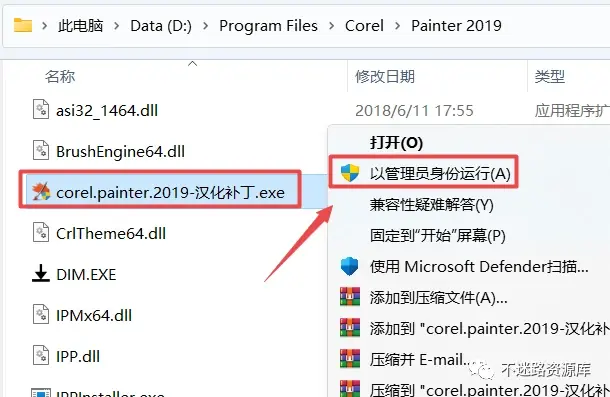 13.找到复制过来的在”corel.painter.2019-汉化补丁.exe“文件,鼠标右键选择“以管理员身份运行”