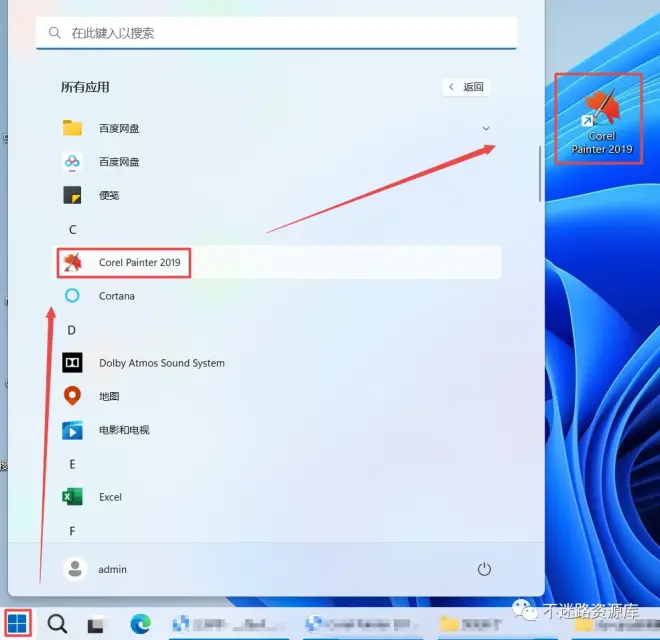 10.点击“开始“菜单栏,找到“Corel Painter 2019“软件,鼠标左键拖拽到桌面上即可创建桌面快捷方式
