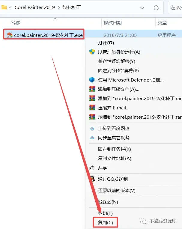 9.返回之前解压的“Corel Painter 2019”文件夹,双击打开“汉化补丁”文件夹,鼠标右键点击“corel.painter.2019-汉化补丁.exe”选择“复制”