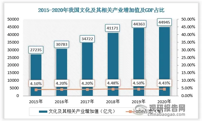 近年来文化及其相关产业增加值不断提高,据数据,2015-2021年我国文化及其相关产业增加值由27235亿元增长至44945亿元,其对国内生产总值的贡献率也不断提升,占比由4.1%增长至4.43%,带动与之相关的文化创意产业营收增长。2016-2021年我国文化及其相关产业营业收入由80314亿元增长至119064亿元,规模以上文化创意设计营业收入由9854亿元增长至19565亿元,占比由12.9%提升至16.4%。