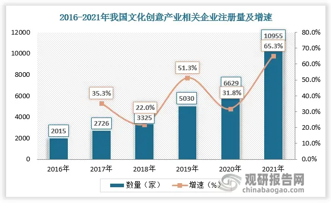 文创产业蓬勃发展下文创企业大幅增加。数据显示2016-2021年我国文化创意产业相关企业注册量由2015家增长至10955家。目前我国文化创意产业相关企业总量超3.6万家,其中陕西、江苏、广东文创在业/存续文创相关企业数量排名前三,分别为5801家、3476家、3348家,占比15.94%、9.55%、9.20%。