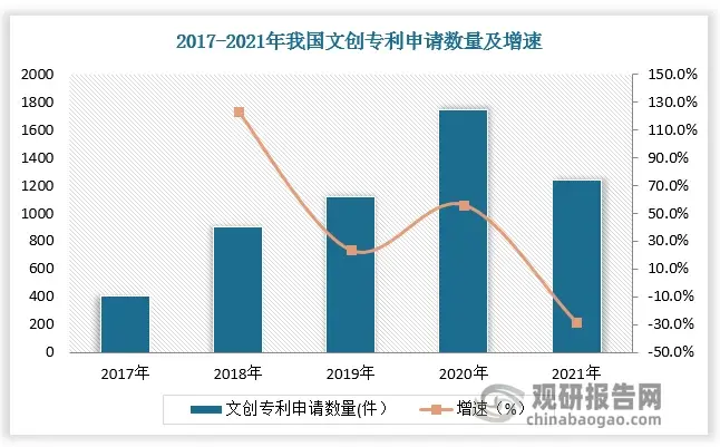 文化创意产业是经济转型升级的重要动力和国家软实力竞争的重要手段。近年来各项文化创意行业相关政策的出台表明,我国对发展文化创意产业的重视程度不断提升。根据数据,2017-2020年我国文创专利申请数量连续四年保持增长,2021年我国文创专利申请数量有所下降,为1243件,同比减少28.7%。其中广东省文创专利申请数量最多,占比19.54%。