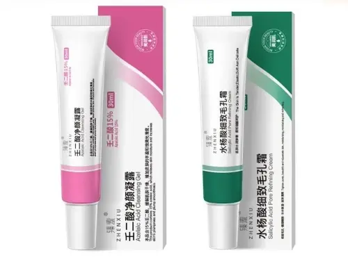 这款祛痘产品有两个单品,红色的白天用,绿色的晚上用,它们的主要成分是壬二酸,可以促进皮肤代谢出多余角质和油脂。