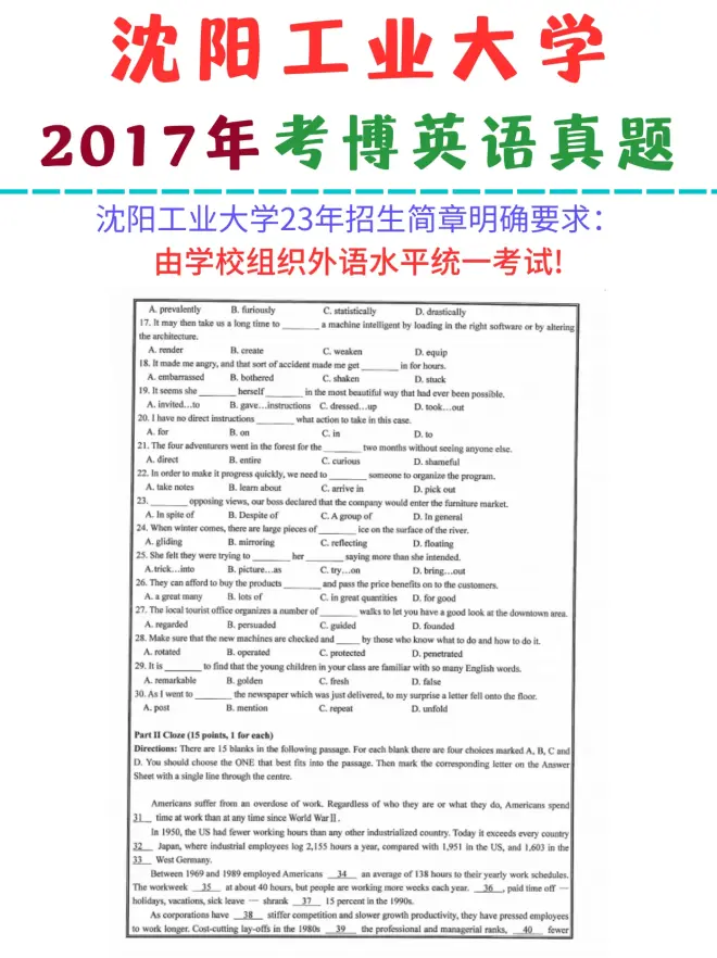 小屋收集整理了沈阳工业大学2017年考博英语真题分享给大家,希望对大家有帮助。