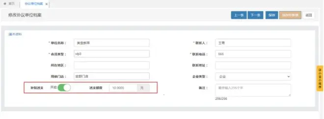 当会员补贴余额为0时,若协议单位档案开启允许补贴透支,会员可以根据设置的透支额度进行透支,若未开启补贴透支则不允许透支使用。