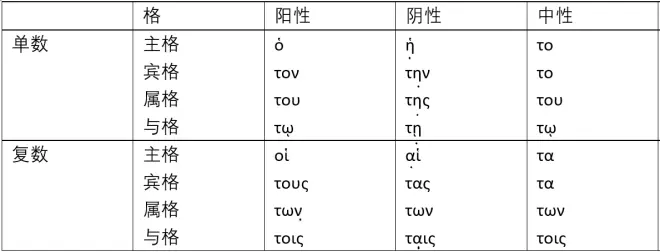 •虽然有这些变形,阴性定冠词却总是按照相同的规律变化(3.3.3已给出)。因此,举例言之,ἡ δοξα,την ἡμεραν。