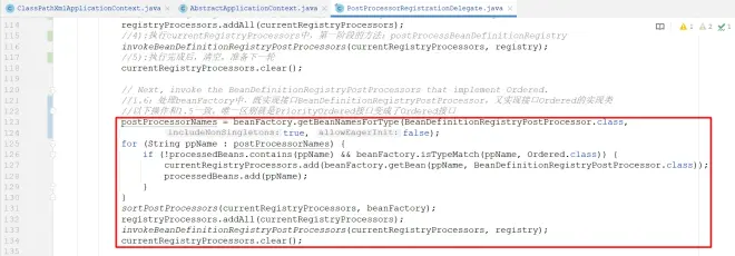 现在,我们可以看到接下来的代码逻辑基本和我们前面分析的一样,只不过,现在处理的并不是实现接口PriorityOrdered的BeanDefinitionRegistryPostProcessor了,而是处理实现了接口Ordered的BeanDefinitionRegistryPostProcessor。