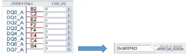 所以我们在固件里针对slice0的配置,需要去按照X100 DQ7~DQ0的顺序,填入对应的LPDDR4的DQ编号。
