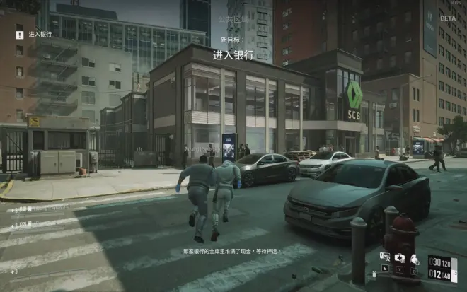 本次测试所开放的任务是游戏的标准差事——抢银行。二代也有类似的关卡,进入银行,钻开金库,拿钱撤离,是非常标准的流水线作业。而三代的这个标准关卡,则有了更多复杂的机制。