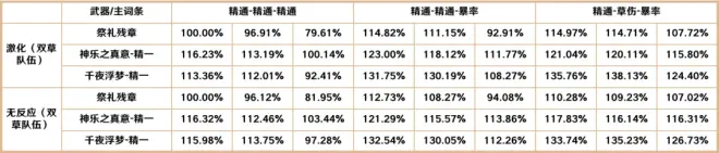 2.由于结果为主词条相同,携带黎明神剑/磐岩结绿时黄金套表现相对纺锤降低,如调整为各武器携带最优主词条(黄金套可以调整为防-防-暴),相对华馆整体提升约0.5%至1.5%。