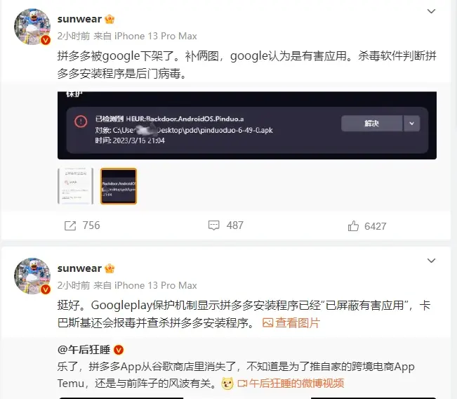 谷歌发言人埃德·费尔南德斯 (Ed Fernandez) 表示,“通过 Google Play Protect 强制执行此应用程序的非 Play 版本,发现这些版本包含恶意软件”,指的是不在 Google Play 上的拼多多版本。