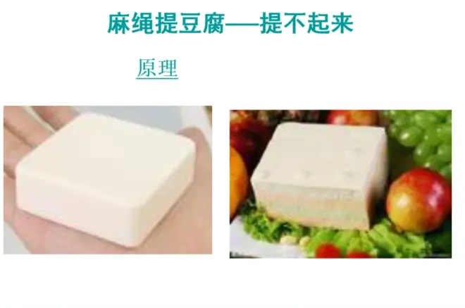 5.麻绳提豆腐,提不起来——在压力一定时,如果受力面积小,则压强就大。