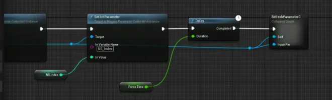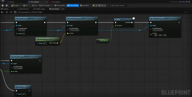在GE里,还是通过NiagaraParameterCollection向Niagara传值。在延迟0.5S后,发生爆炸。结冰的效果主要通过Radius的值来实现。通过从0增长到我们所需要的爆炸半径在回归到0。注意还要确定GE的方向,这样好确定大冰花爆炸的朝向。