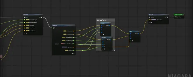 这一部分比较复杂,连线也不好看,可读性不强,这时候用HLSL写可能还更易读一些。龙卷风的力我打算用线吸引力和漩涡力组合实现,由于有两个龙卷风所以要写两个。这些其实都是点开官方自带的LineAttractionForce和VortexForce简化而来的。