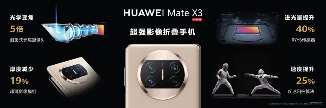 华为 Mate X3内置4800mAh电池,Mate X3典藏版为5060mAh,支持66W快充、50W无线充电和7.5W无线反向充电;后摄配备5000万像素主摄(索尼 IMX766)+1300万像素超广角镜头(索尼 IMX688)+1200万像素5倍潜望式长焦镜头(索尼 IMX688),搭载超感知XMAGE 影像。