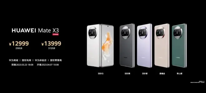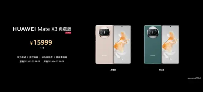 华为 Mate X3的256GB版售价12999元,512GB售价13999元,Mate X3典藏版1TB售价15999元,3月23日预售,4月7日全平台开卖。