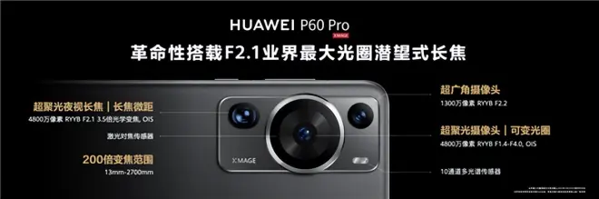 华为P60 Pro升级长焦镜头,配备了4800万像素RYYB的超聚光夜视长焦镜头,兼顾长焦微距功能,支持3.5倍光学变焦、OIS,拥有F2.1超大光圈。