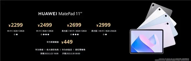 MatePad 11 2023款平板电脑起售价2299元(6+128GB),柔光版起售价2699元(8+128GB),今晚18:08开启预售。