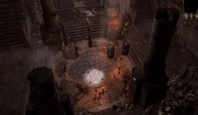 7、来到大厅,可以看到四个转盘。按照提示转动石盘: