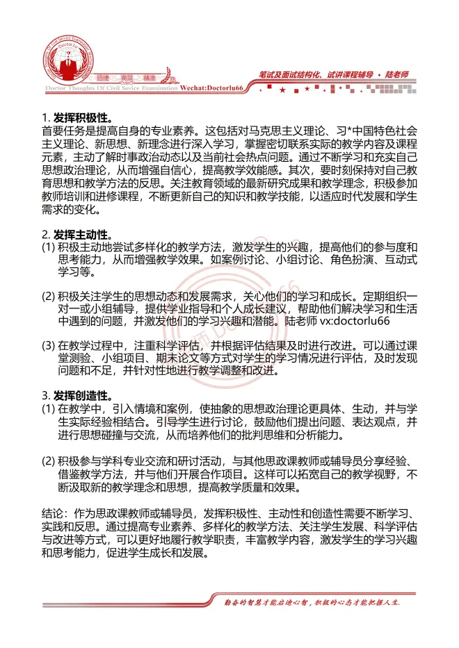 1. 思想政治理论课教师座谈会提到,办好思政理论课关键在教师,关键在发挥教师的积极性,主动性、创造性。作为思政课教师或辅导员,你如何发挥积极性,主动性,创造性?(15分)