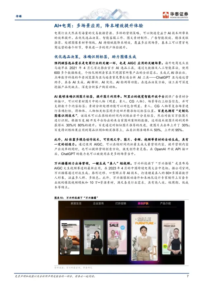 游戏方面,AI 已经在素村原画生成、代码辅助编写等领域落地,并且A1+玩法在不断尝试创新。电商方面,AI 可以用于产品推荐、智能投放和智能客服等,能够有效提升工作效率。营销方面,AI 能够创新广告形式,提高营销内容生产效率。