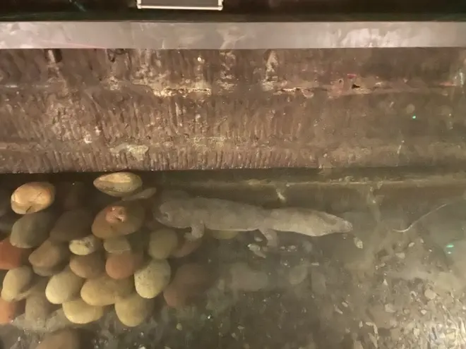 这里有一个水池,里面有几条娃娃鱼