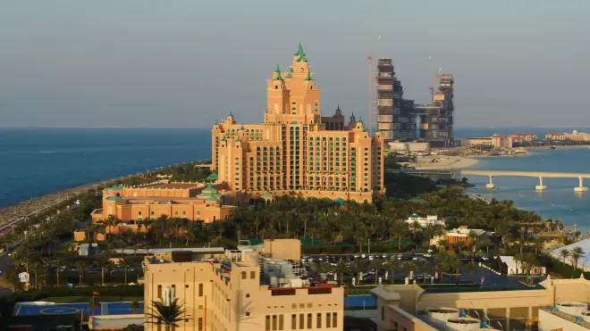 杜拜的亚特兰蒂斯饭店于2008年9月24日才开幕,是位于杜拜棕榈岛上的第一家开幕饭店,以失落的亚特兰蒂斯为名,希望成为一个现代的乐土。这个耗资15亿美元的奢华饭店,最大的特色就是有一个超大型的咸水湖,模仿沉入海底的亚特兰蒂斯帝国,里面饲养了6万5千条鱼,还有一个海豚池,养了20多条瓶鼻海豚,而在这个渡假村形态的饭店中,甚至还有自己的水上乐园,以适宜全家的海洋主题休闲娱乐活动为主要号召。