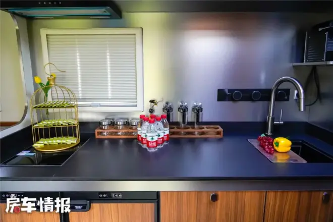 下方双开门冰箱,冷冻冷藏都可以;蒸烤一体机,旅行途中也能实现糕点自由。