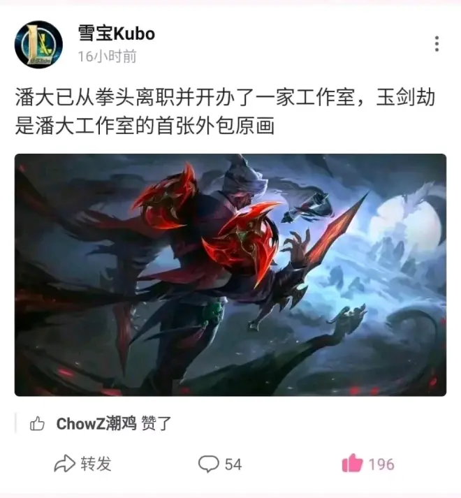 最后咱们来说一说,和游戏本身相关的内容,最近几个赛季,拳头设计师、插画师离职的消息频繁传出,这也不禁让很多玩家担忧LOL的未来,毕竟有能力的人走得七七八八,游戏质量早晚会下降,而在近日,知名插画师潘伟诚的学生爆料,这位首席插画师已经离开拳头,以工作室外包的形势保持合作。