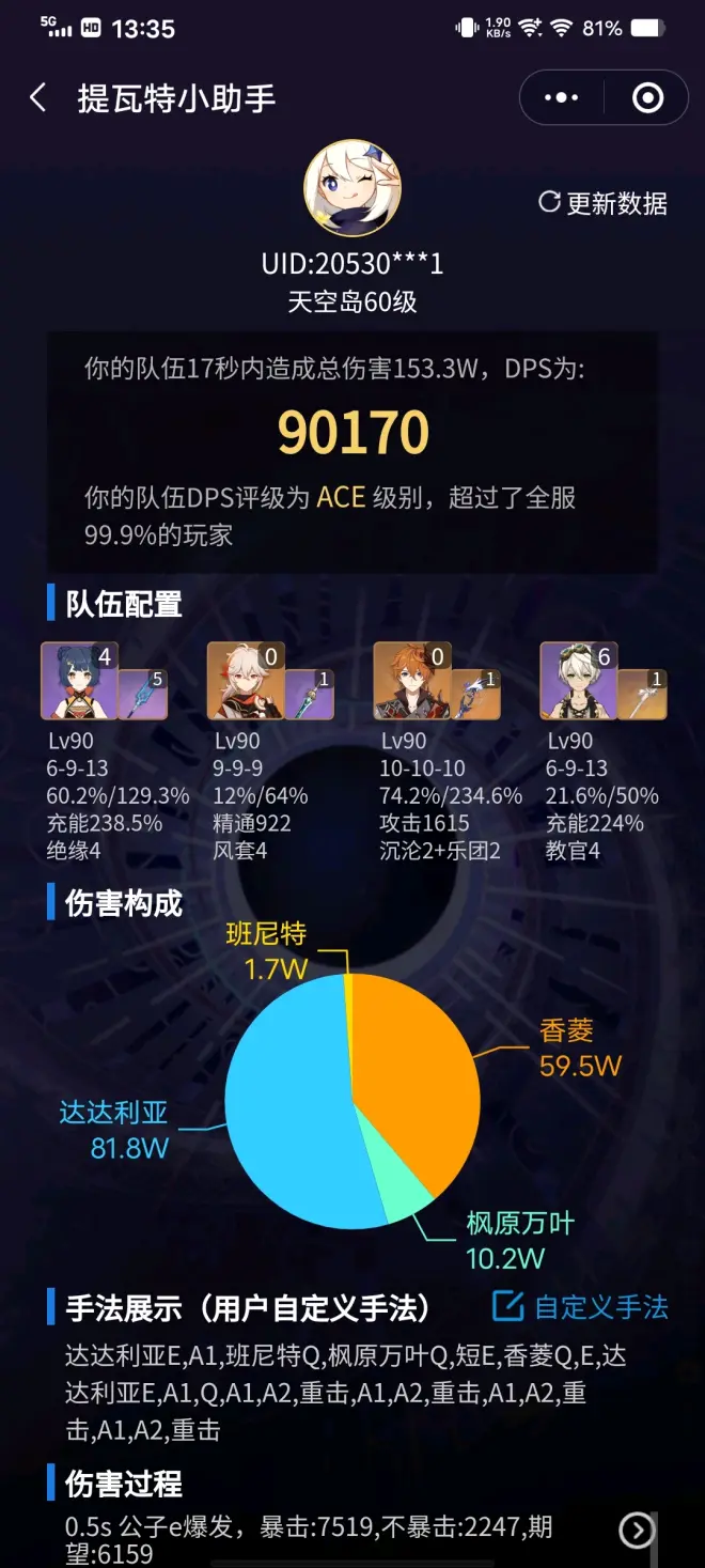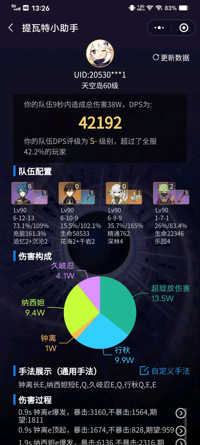 万达手法以前有一个超九万的,想不起来了,二判三判好像小助手算不出来,反正我也不咋用的出来三判,10万我到不了了,可以说我装逼。草国草神练度提了,本来是50,109,664精,久岐忍应该没变,久岐忍精通是984,四乐园,算上草神专武是1024精通,不吃草神大招,一个种子大概好像是3.7起,平时伤害太乱,没在意,吃大招的话好像是4.2还是4.1起。带钟离是因为懒的操作,而且我没有海参