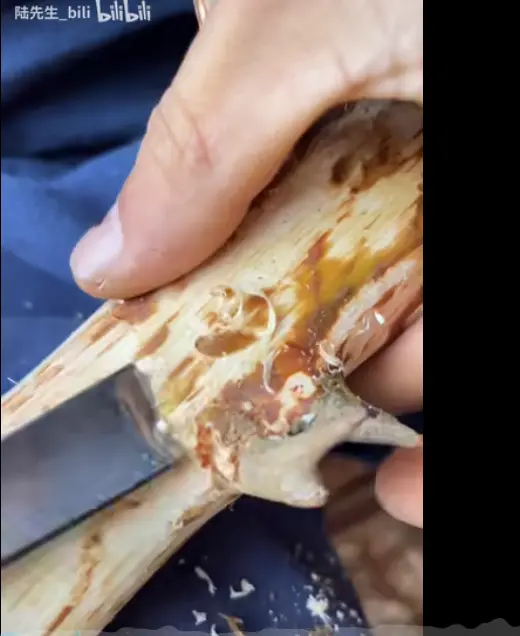 2️⃣作者亲自锯木头,烤鸡和烤地瓜,骨头喂狗吃