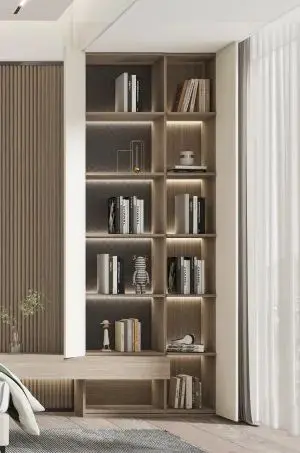 床头柜与微型书柜相结合,在落地窗前,构建出一块阅读放松的休闲空间。