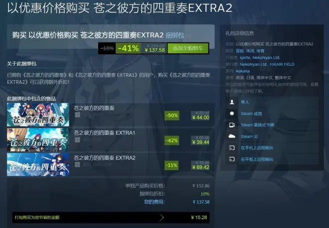 所以购买选择上也就不用多说了,您直接入手包括正篇、EXTRA1、EXTRA2在内的捆绑包就完事了,省事省心的同时还可享受10%的额外折扣。此外HF也超懂强迫症玩家们的痛点,为了配合EXTRA2的首周折扣,目前正篇、EXTRA1也正以史低促销中。所以还在犹豫什么赶快买买买吧,这价格真的可以了,生活不易还是需要经常补充美少女能量的。