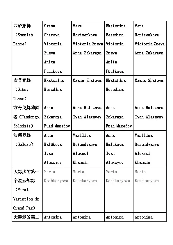 演出中有罗斯蒂斯拉夫•扎哈罗夫(Rostislav Zakharov)编导的“吉它之舞”和“吉格舞”,由瓦西里•索洛维埃夫-塞多伊(Vassily Soloviev-Sedoy)作曲;卡西扬•戈列佐夫斯基(Kasiyan Goleizovsky)编导的“吉普赛舞”,由瓦列里•维克托罗维奇•热洛宾斯基(Valery Viktorovich Zhelobinsky)作曲;阿纳托利•西马切夫(Anatoly Simachev)编导的“方丹戈舞”,由爱德华•纳普拉夫尼克(Eduard Nápravník)作曲。