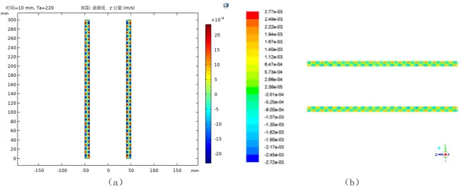 如图9所示,(a)为本文模型泰勒数Ta等于220第10分钟时环隙间的轴向速度分布图,(b)为参考文献模型泰勒数Ta等于220时环隙间的轴向速度分布图。从图9可以看出,两组模型切向速度分布规律基本一致,且速度的最大最小值也基本吻合。