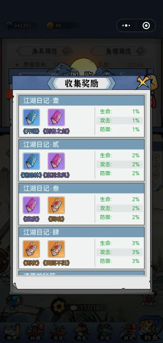 渔具升级顺序,先鱼线和鱼漂,杆和饵可以保持白板不动以开图鉴为主。